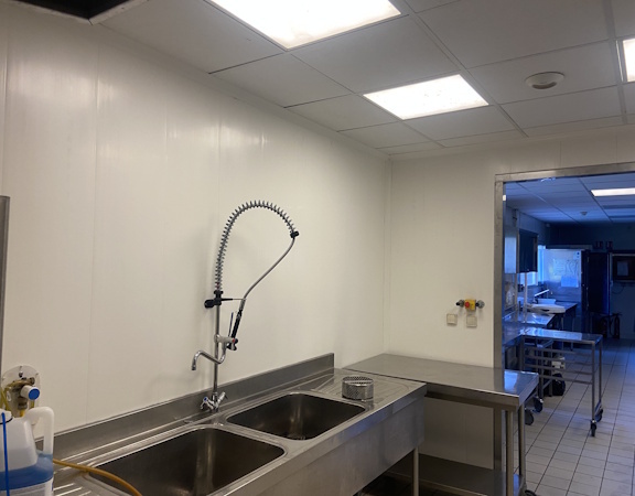 Remplacement du plafond en dalle 600x600 par des panneaux isothermes et remplacement des plinthes PVC par des plinthes en polyéthylène avec joints hauts et bas.